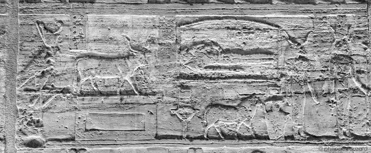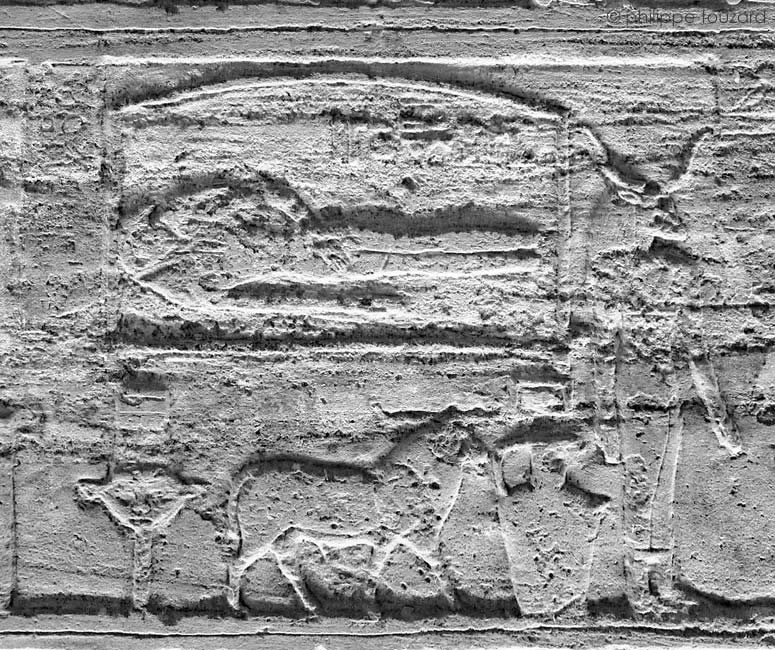 Encore 2 déesses Hathor : une debout tenant le sceptre Ouas (17) et une à tête de vache (18). Ensuite, en haut, une momie est représentée de face dans un cercueil,Osiris ? (19) au dessus d'un bélier, Khnoum avec son vase et d'une figure hathorique de face. Une vache sur un piédestal représente encore Hathor (20) précédant un faucon, Horus fils d'Isis, portant la double couronne (21) sur un perchoir tenu par un petit individu agenouillé..