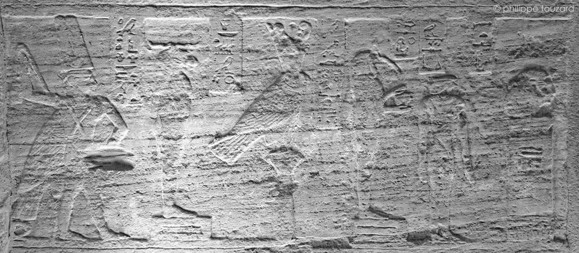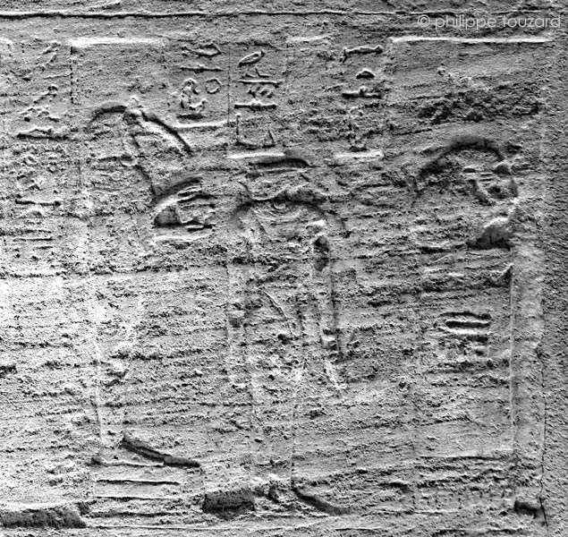 Deux prêtres, en fait ses enfants Horus et Ihy font face à Hathor (15) assise sur un trône et portant deux grandes plumes. Ensuite une autre Hathor (16) sous forme d'une femme assise sur un trône portant un disque entre 2 cornes