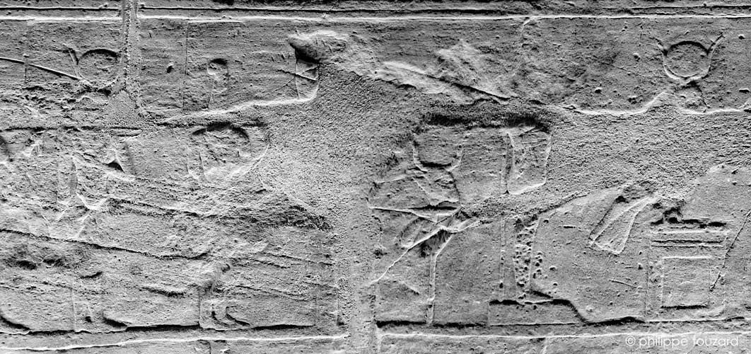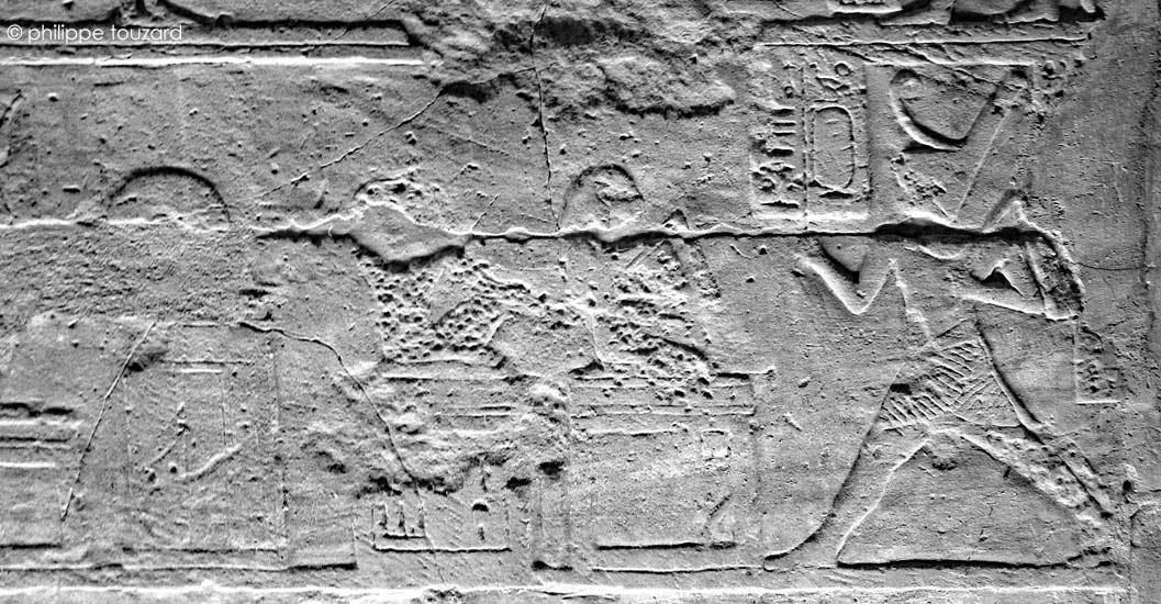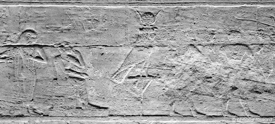 n°11.Un autre faucon à tête de femme portant un disque avec deux cornes se tenant debout sur un pavois représente peut-être Hathor.