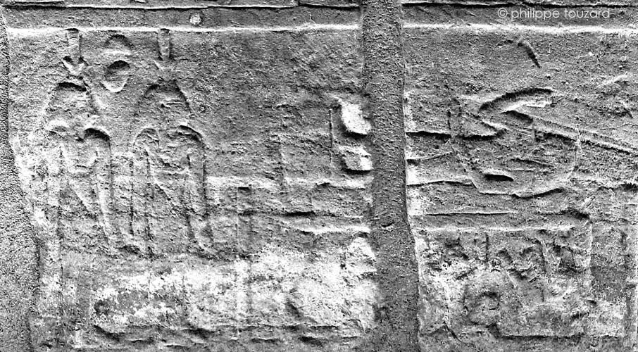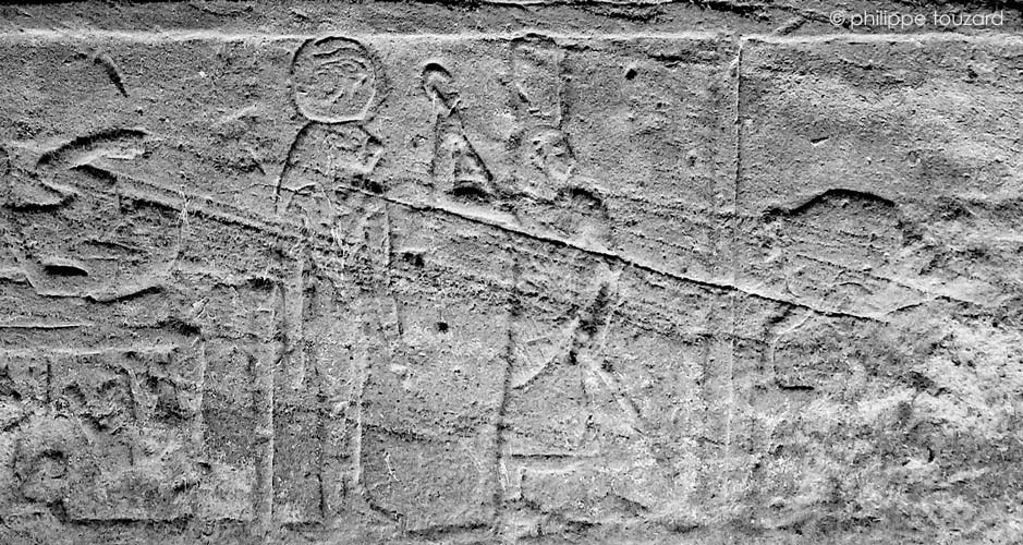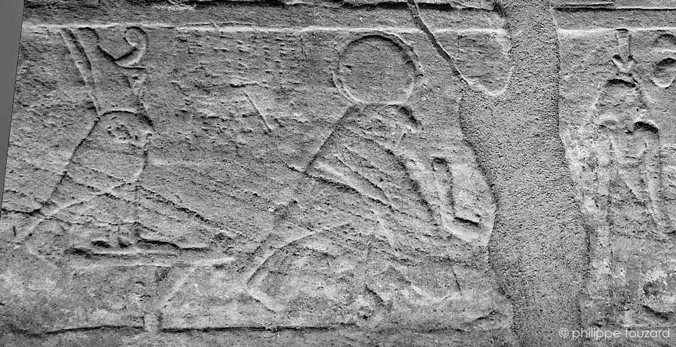 n°7. Un faucon à tête humaine (Horus?) se tient avec un grand couteau et transperce un crocodile.