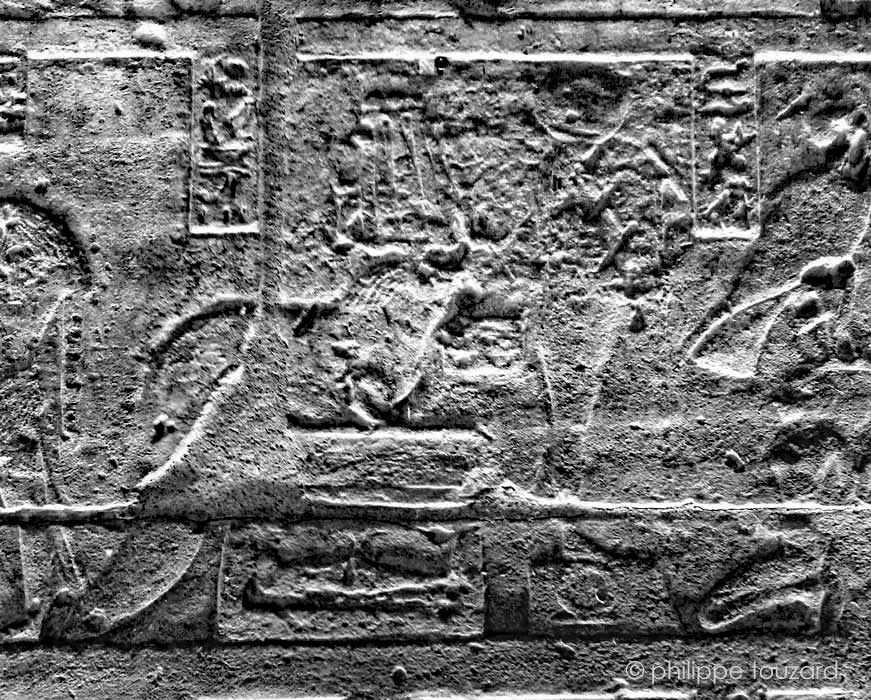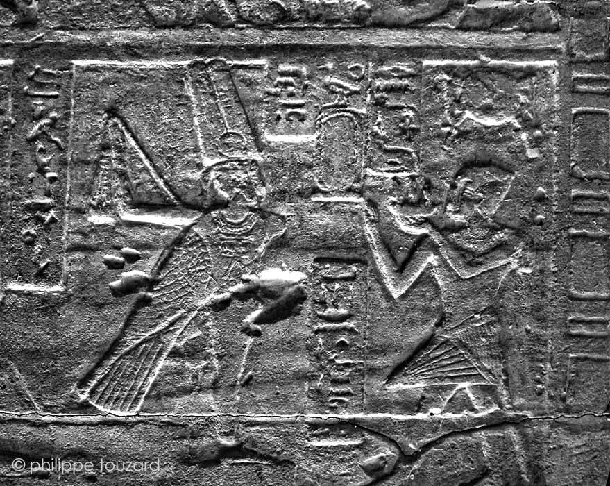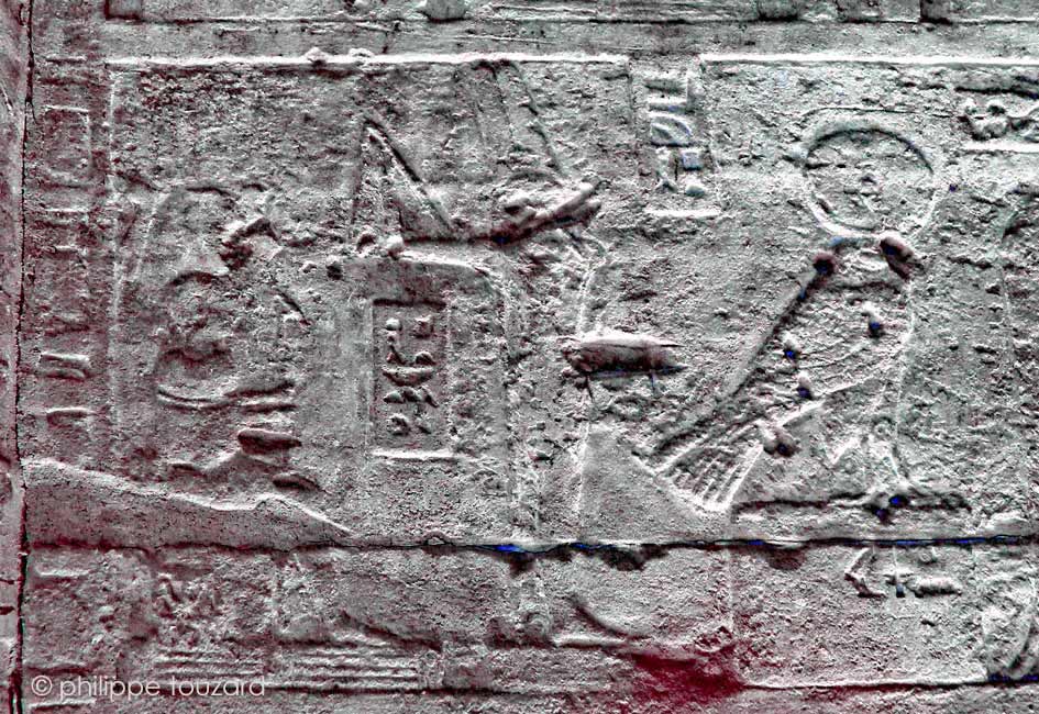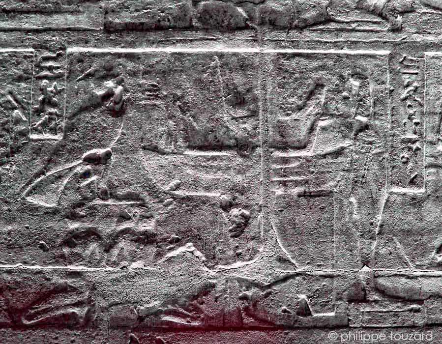 n°2. Amon-Rê, le seigneur du temple est représenté ithyphallique, avec des ailes et une queue de faucon. Il porte deux grandes plumes sur sa tête.