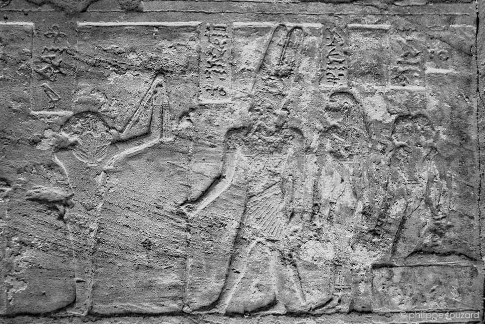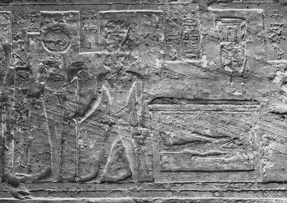 n°14.Un ibis couronnée se tient sur un Seama-Taouy, 'Thot doublement grand, seigneur d'Hermopolis, grand dieu, qui s'est fait seul'. Un homme agenouillé tient le signe de l'union de l' Égypte.