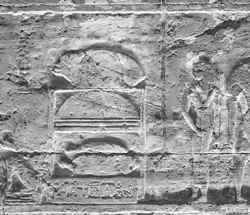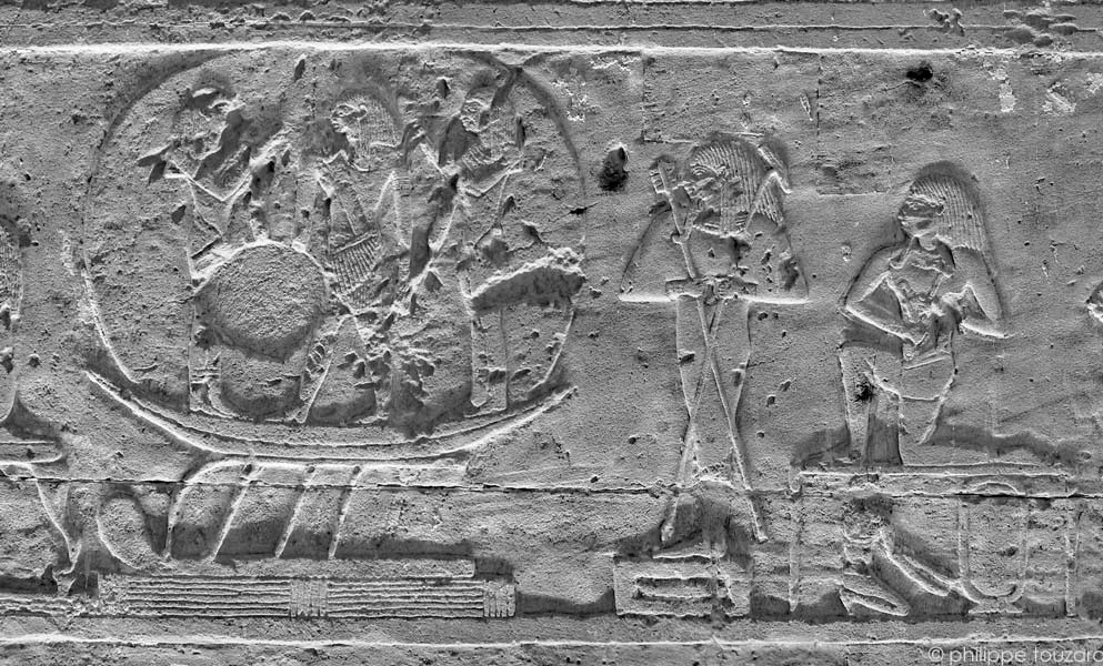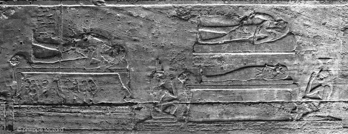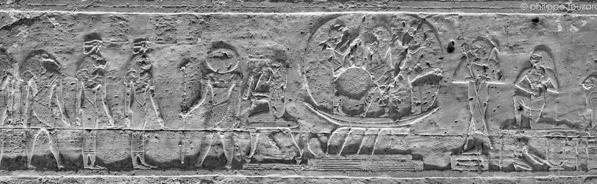 posé sur une barge. À l'intérieur du disque, un dieu entouré de 2 déesses qui lui tiennent les mains. Enfin, en 18, un dieu sur un piédestal tenant dans ses mains croisées 2 sceptres. En 19, un dieu sur un piédestal plus haut tenant 2 signes ankh dans ses mains