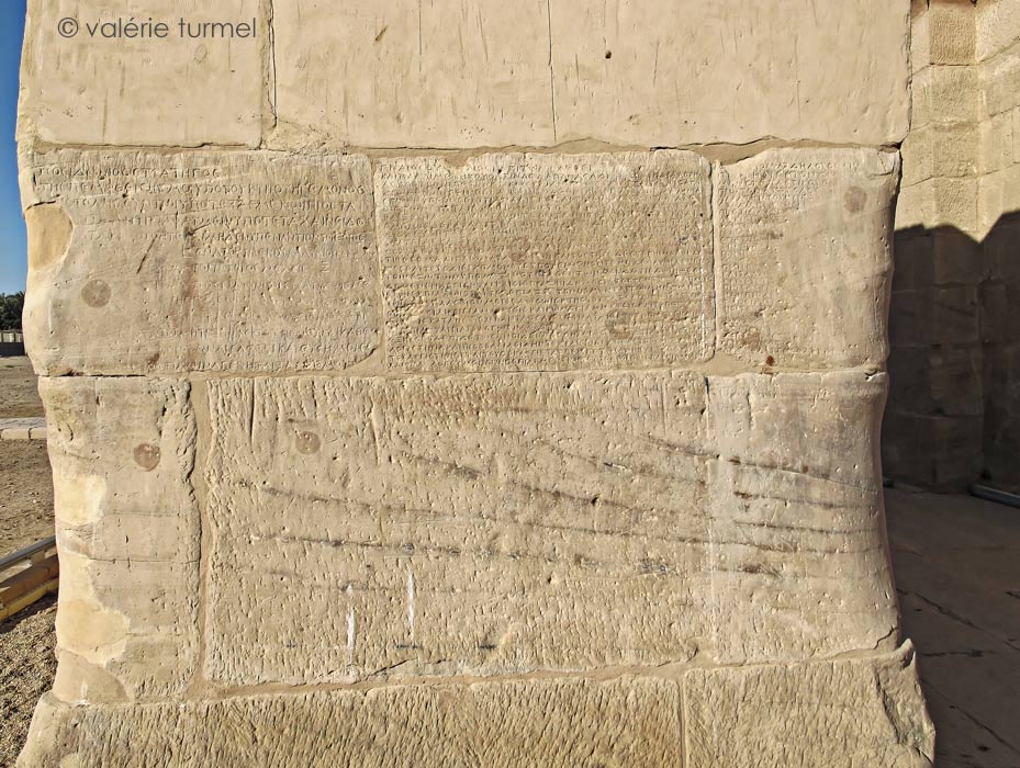 Tiberius Iulus Alexander fut préfet d'Égypte de l'an 66 à l'an 69 de notre ère. En l'an 68 fut gravé le texte A, début de l'édit sur la paroi Sud interne de la Grande Porte, en dessous la scène d'offrande aux dieux. Ce texte ne fut pas continué. L'ensemble du texte (B) a été ensuite gravée en 69 sur le montant extérieur Nord de la porte extérieure. Ce texte reprend le texte A.. (Part II, p.23-24)
