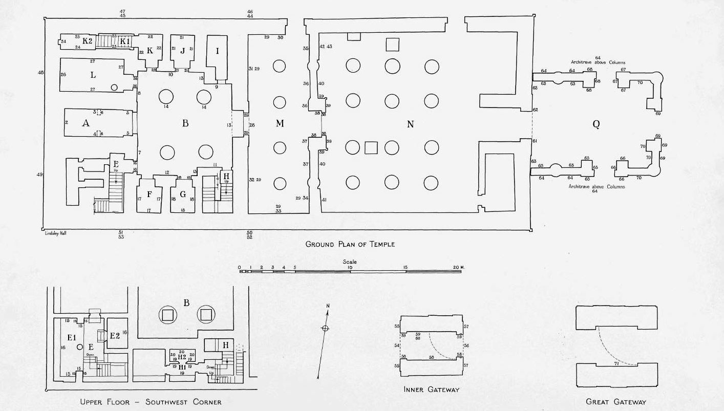 Deux des trois portes sont dessinées en bas à droite. Ensuite se trouve le bâtiment principal précédé d'un portique construit sous les Necttanebo (Dynastie XXX, -380 à -343).. La première hypostyle (N) serait due à Achoris (-393 à -380, Dynastie 29). Le reste de l'édifice a été construit précédemment par Darius Ier (-521 à -486).Deux escaliers permettent d'accéder aux salles du toit qui sont partiellement décorées. Les parois extérieures sont elles-aussi décorées en grande partie. Les nombres indiquent les numéros des planches de Davies sur la décoration des parois (The temple of Hibis,Part III, The decoration). (Plan de Wikipedia Common).
