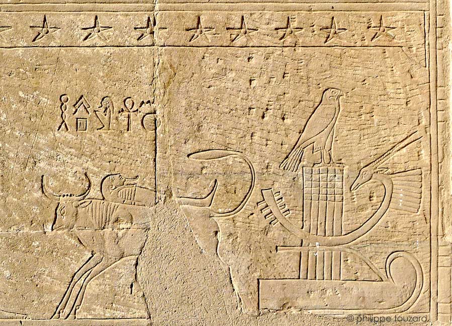 Apis vivant transporte une momie vers Nephtys. A droite, la barque de Sokar.