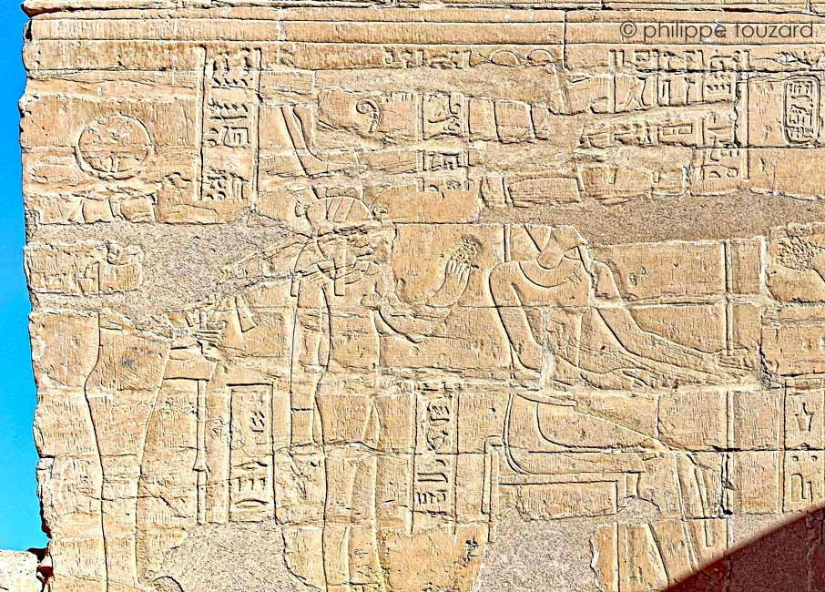 Le temple est dédié à la Triade Thébaine qui est représenté sur les linteaux des portes et sur les parois de la salle (ci-dessus sur la paroi Nord). La salle comporte 3 colonnes encore debout, d'où le nom de salle hypostyle dans certains ouvrages. La construction date de Ptoléùée III. Les scènes sur les parois sont datées de différents Ptolémée. S'y trouvent des scènes classiques de Sortie du palais, Purification et Montée Royale.