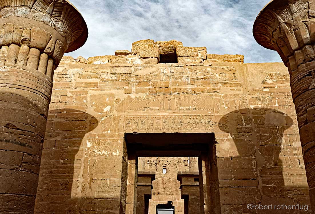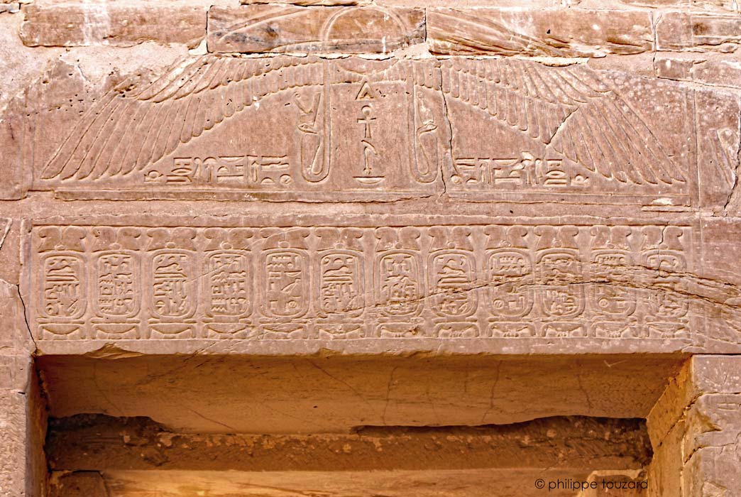 Le linteau est surmonté d'une représentation d'un disque ailé, le faucon Behedety. Une inscription verticale précise : "Donne toute vie et toute puissance". Une double inscription horizontale donne son nom : "Behedety, aux plumes bigarrées quand il sort de l'horizon".