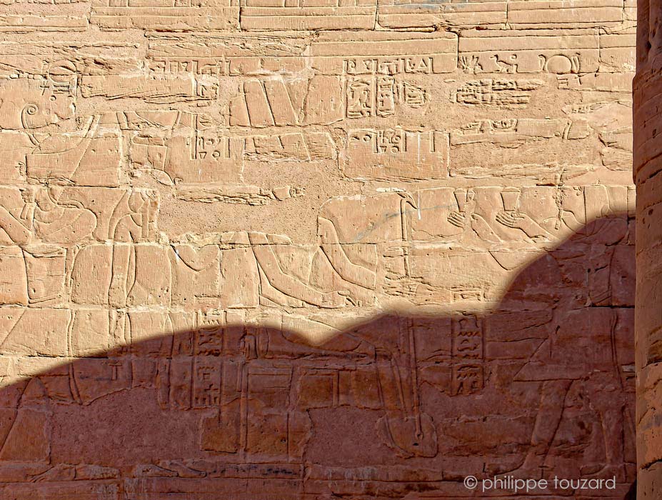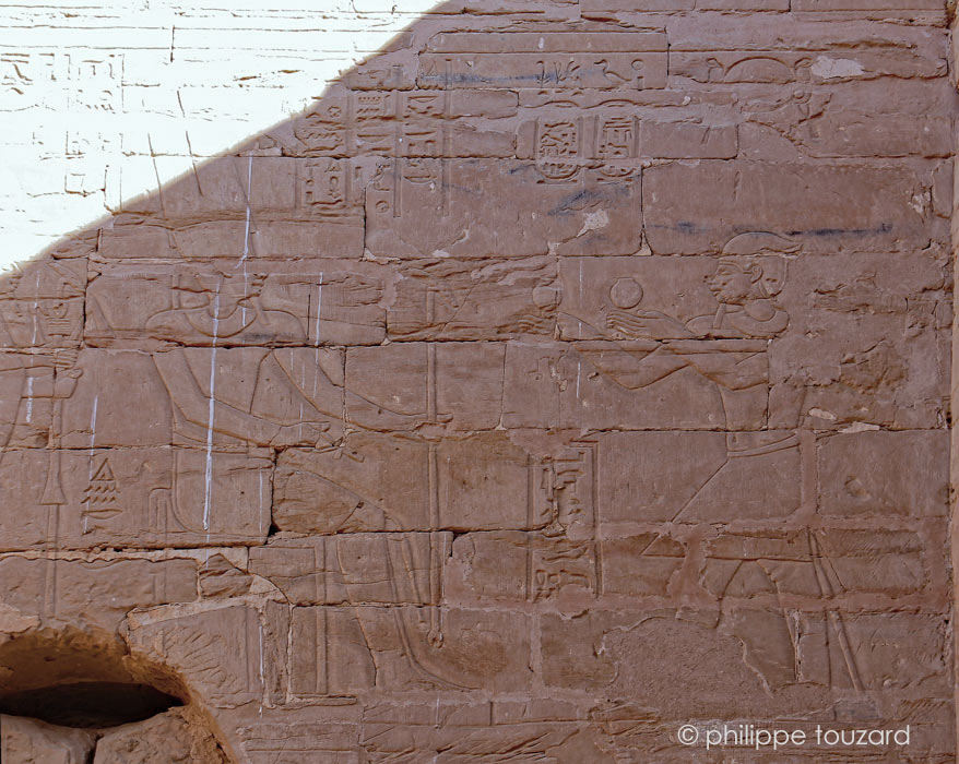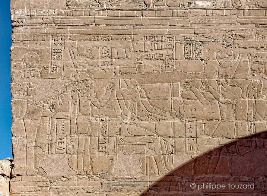 Ptolémée IX Soter fait l'offrande du vin à Amon-Rê suivi du jeune Khonsou (photo partielle).