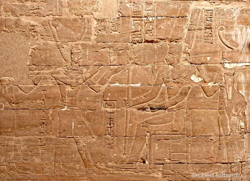 Sue le registre du haut, Ptolémée IV Philopator accompagné de la reine Arsinoë III offre l'image de Maât à Amon-Rê assis sur un trône et Amonet.