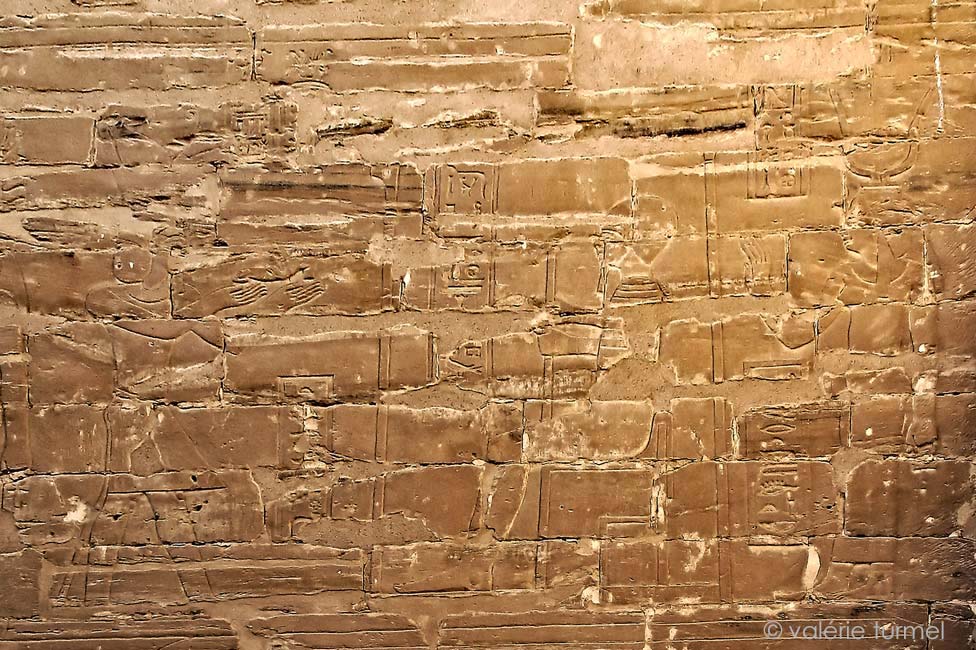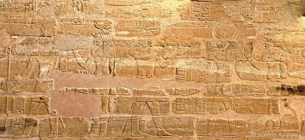La scène ci-dessus appartient au registre du haut, du côté Ouest. La gravure y est très peu marquée. Le roi Ptolémée III (?) fait une offrande d'onguent (?) au dieu Ptah accompagné sans doute de Sekhmet.