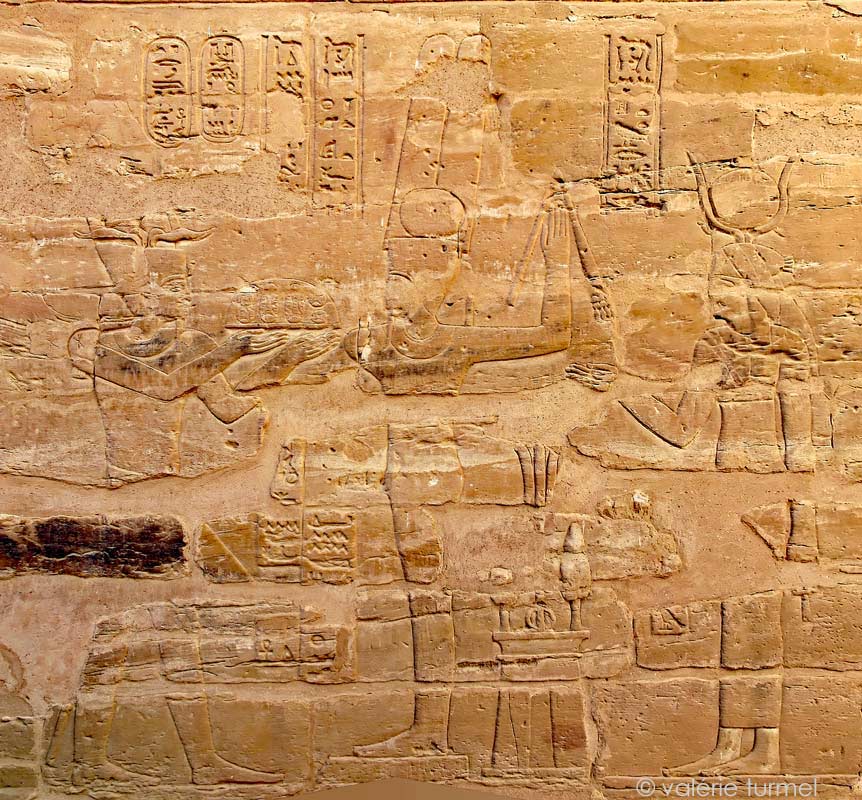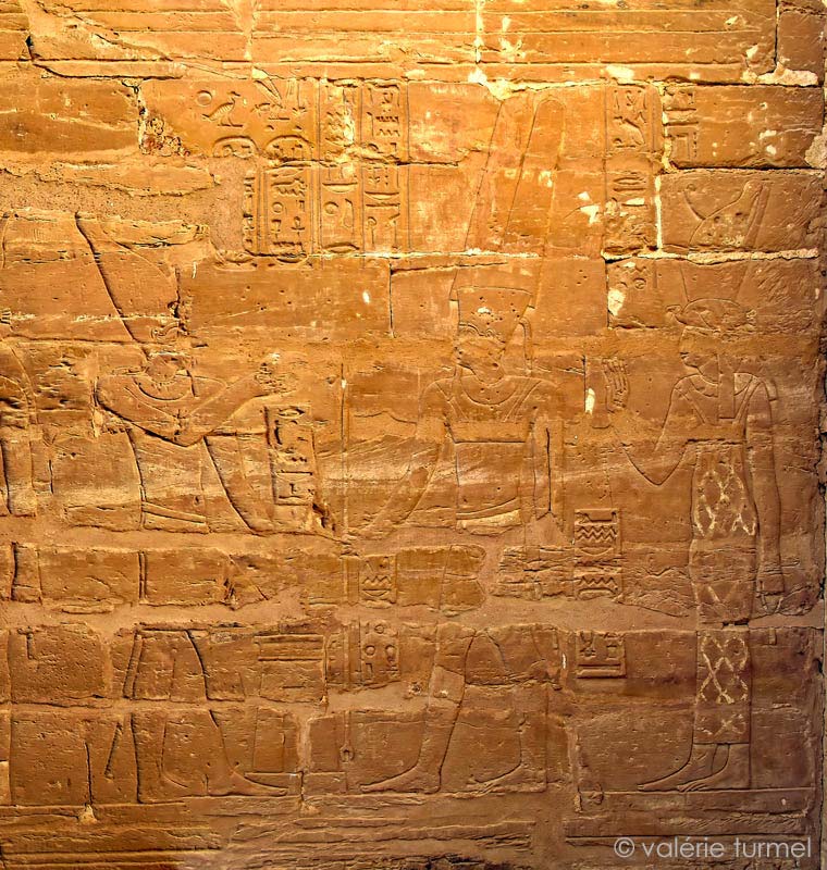 Ptolémée III fait une offrande à Montou accompagné d'Hathor (?). (vue partielle)