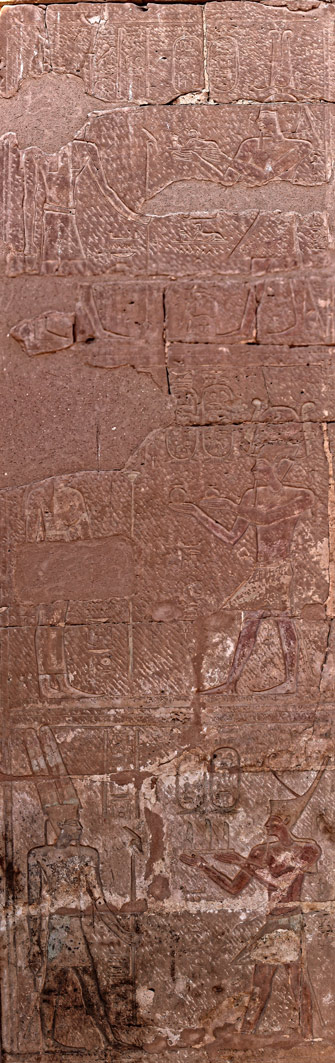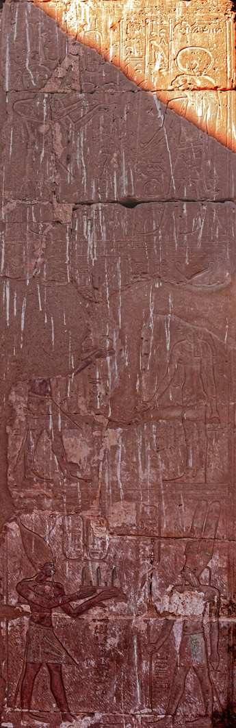 Ptolémée III suivi de la reine Bérénice II offre du vin à la Triade Thébaine. Khonsouu. est représenté avec un tête de faucon. Derrière la Triade, Amon-Rê est assis sur un trône.