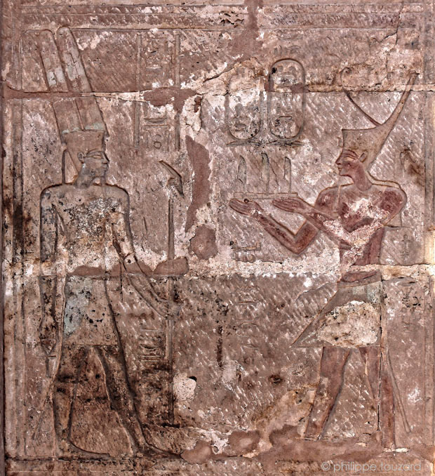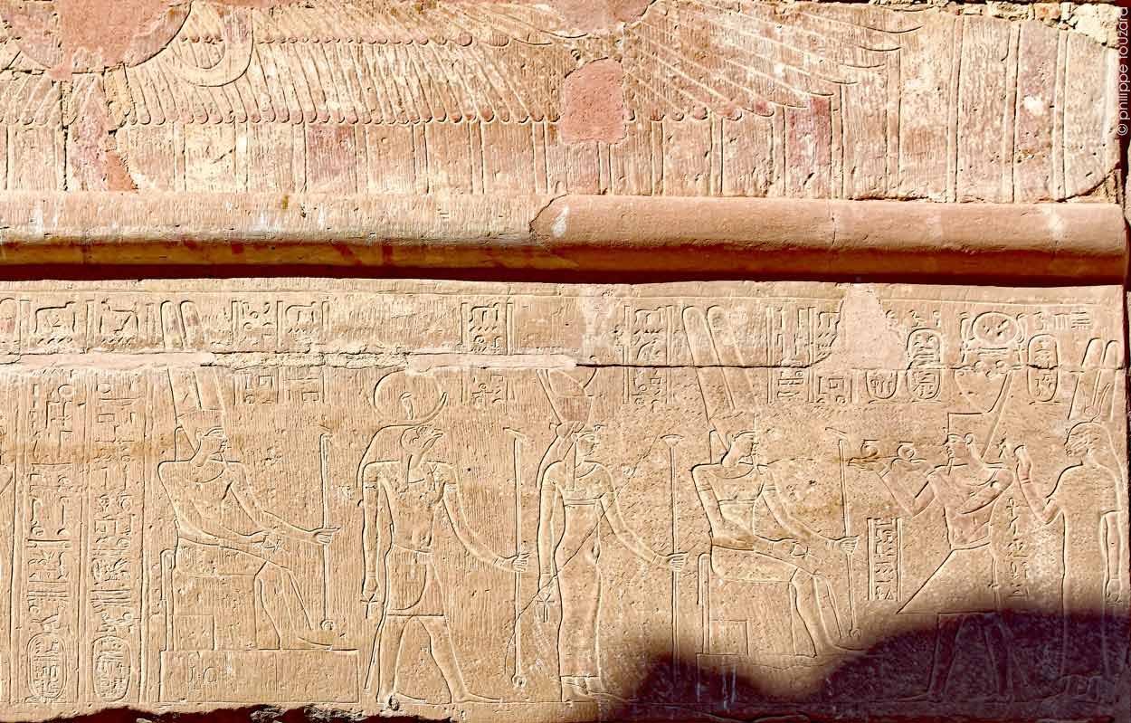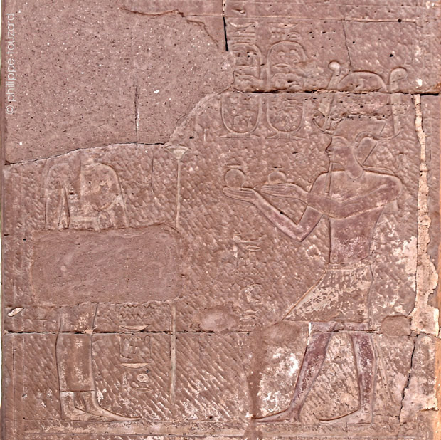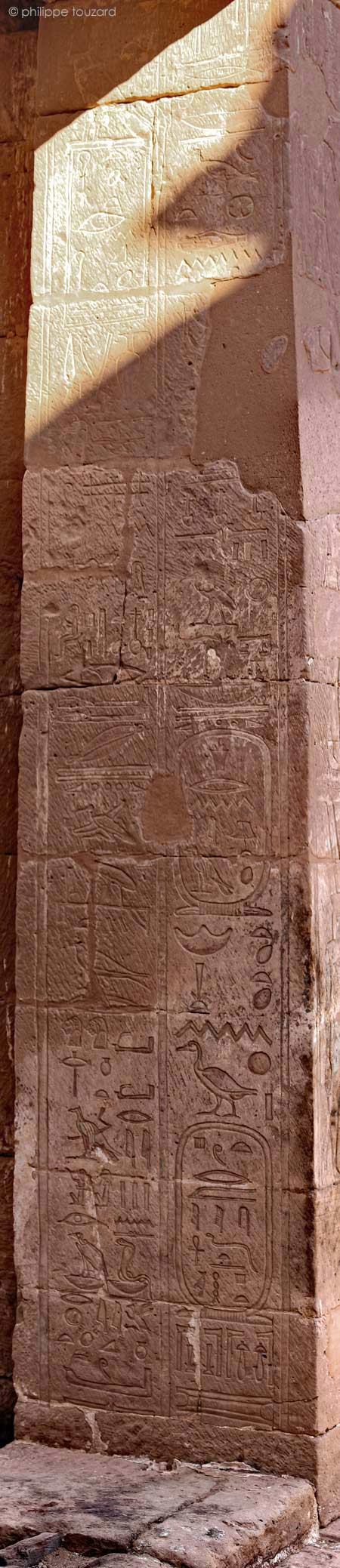 L'embrasure gauche contient un texte condernant Bérénice II et le nom d'Horus de Ptolémée III.