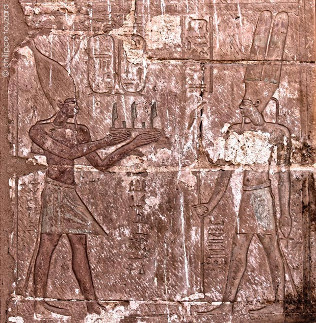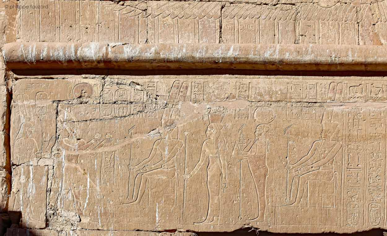 En dessous ldu disque ailé, Ptolémée III suivi de la reine Bérénice II offre du vin à la Triade Thébaine