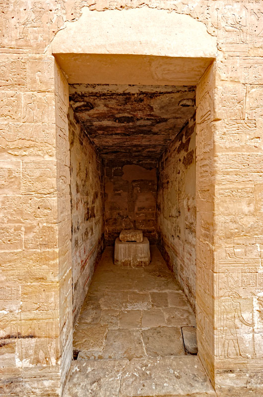 L'entrée du sanctuaire se trouve dans le vestibule, pièce tout en largeur pratiquement dépourvue d'inscriptions, à part celles de la porte du sanctuaire. (voir le plan). Au Sud, est située une petite chapelle v