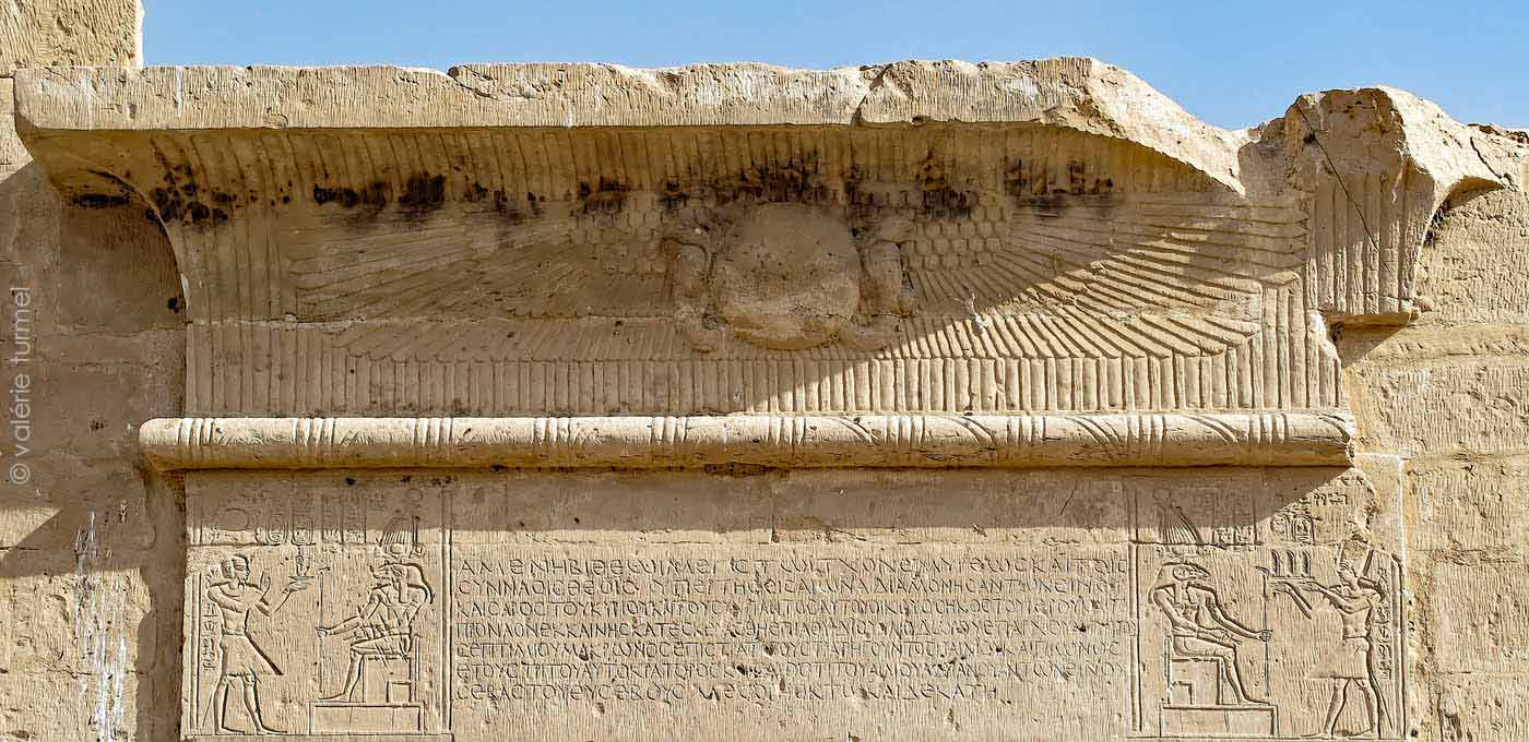 Le centre du linteau porte une inscription en grec datée du 12 aôut 140 sous le règne de l'empereur Antonin le Pieux. Elle commémore la reconstruction du temple dédié à Amenibis (Amon d'Hibis). (Sauneron, p.29)