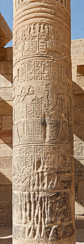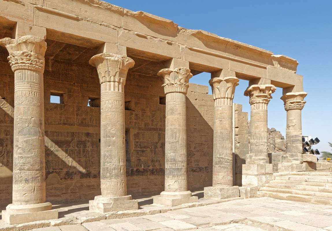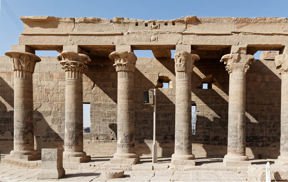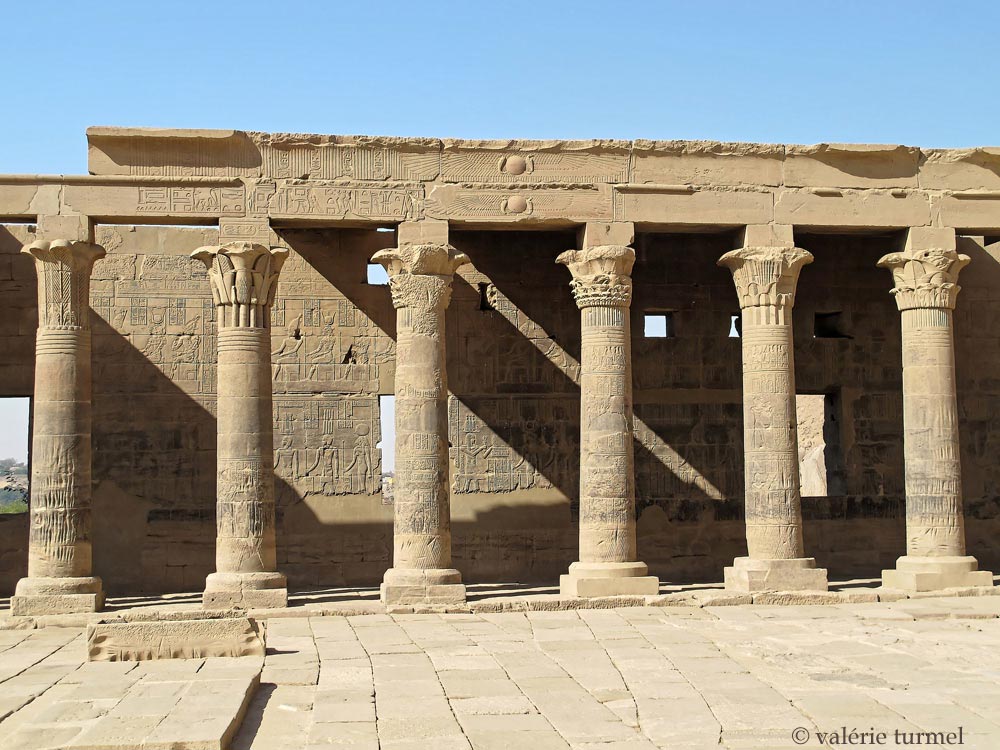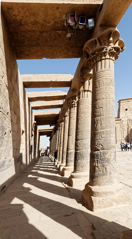 Les premières colonnes montrent la diversité de leurs chapiteaux. Les colonnes mesurent 5,10 mètres de haut. Trois disques ailés ornent la corniche du portique, comme pour copier l'ornementation qui se trouve habituellement au dessus des portes. Ce premier disque se trouve en face du temple d'Arensnouphis, entre les colonnes 9 et 10. Derrière les colonnes, les scènes du mur sont décrites dans les pages suivantes.