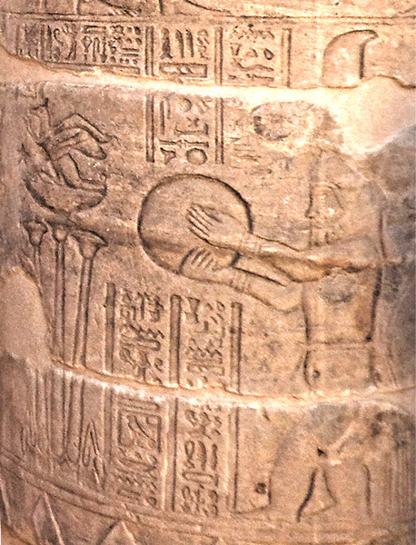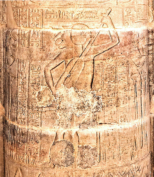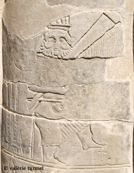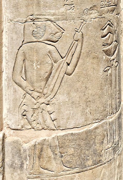 Le dieu Bès joue d'une harpe rudimentaire tout en tenant sa massue de la main gauche. Bès est étroitement associé à Hathor, notamment en tant que dieu de la musique et de la danse; Bès fait partie du cortége qui accompagne Hathor lors de son retour. Des restes de couleur subsistent sur la colonne.