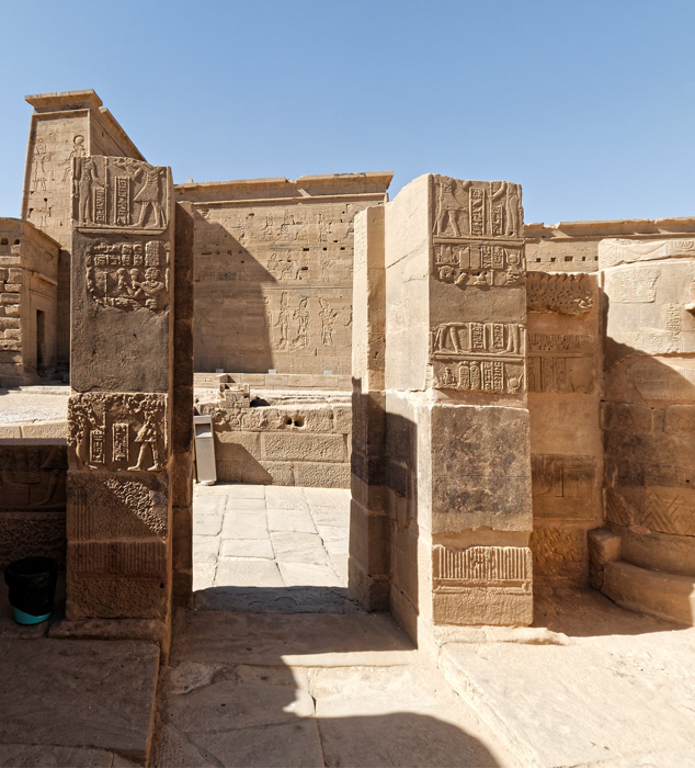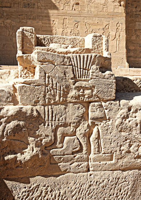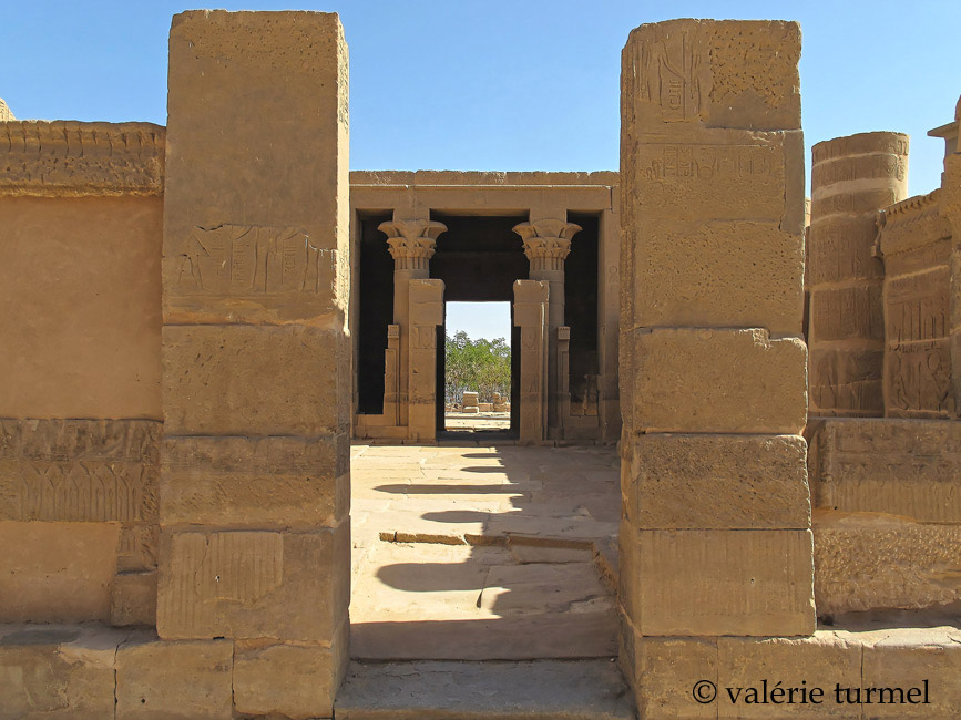En arrière plan, le temple d'Isis et sur le petit muret en face de la porte, le dieu Bès.