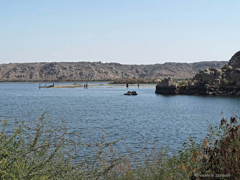 L'île de Philae émerge des eaux du barrage , basses ce jour-là. Des structures métalliques restants du démontage permettent d'en marquer l'emplacement.