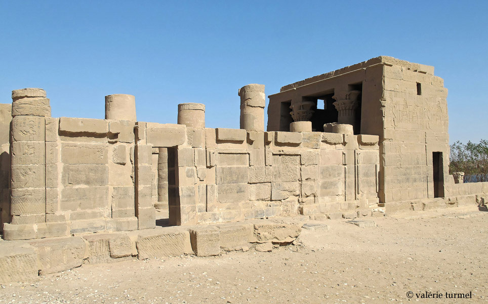 Du côté Sud, comme du côté Nord, seules les grandes façades extérieures du hall du temple sont couvertes de scènes. Les murs-bahuts sont vierges d'inscriptions. La colonne de gauche comporte des morceaux de scènes d'offrandes.