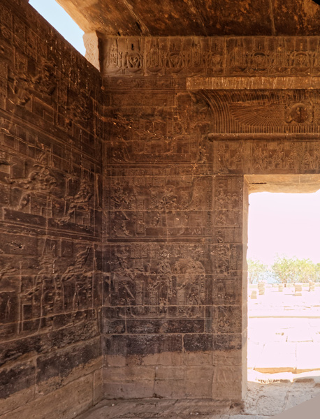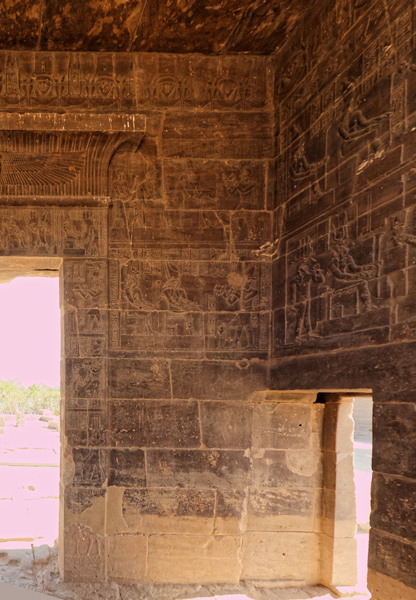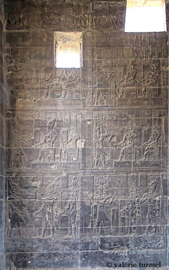 Les trois registres sont surmontés d'une fris d'Hathor. Seul le registre du haut est inscrit avec des textes.
