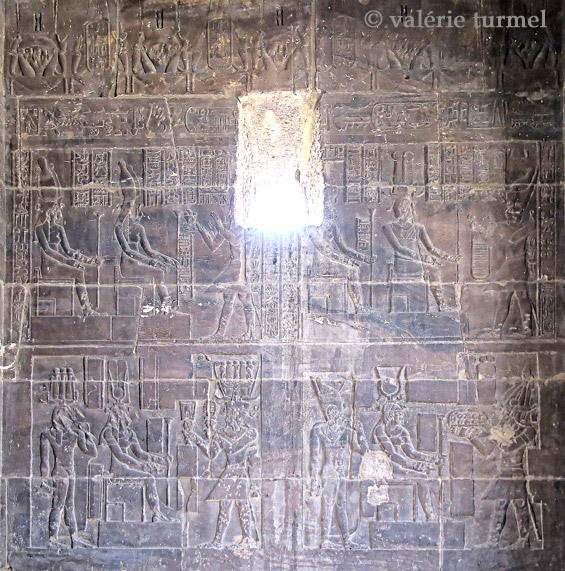 Le hall constituait la salle d'entrée du temple, avant le sanctuaire. C'est une sorte de vestibule, pièce beaucoup plus large que profonde. Une porte était percée dans la paroi Sud pour permettre la sortie vers l'extérieur. Les différentes scènes sont présentées dans cette page et la suivante. Une frise de visages d'Hathor aux oreilles de vache et de cartouches du roi court tout autour de la salle.