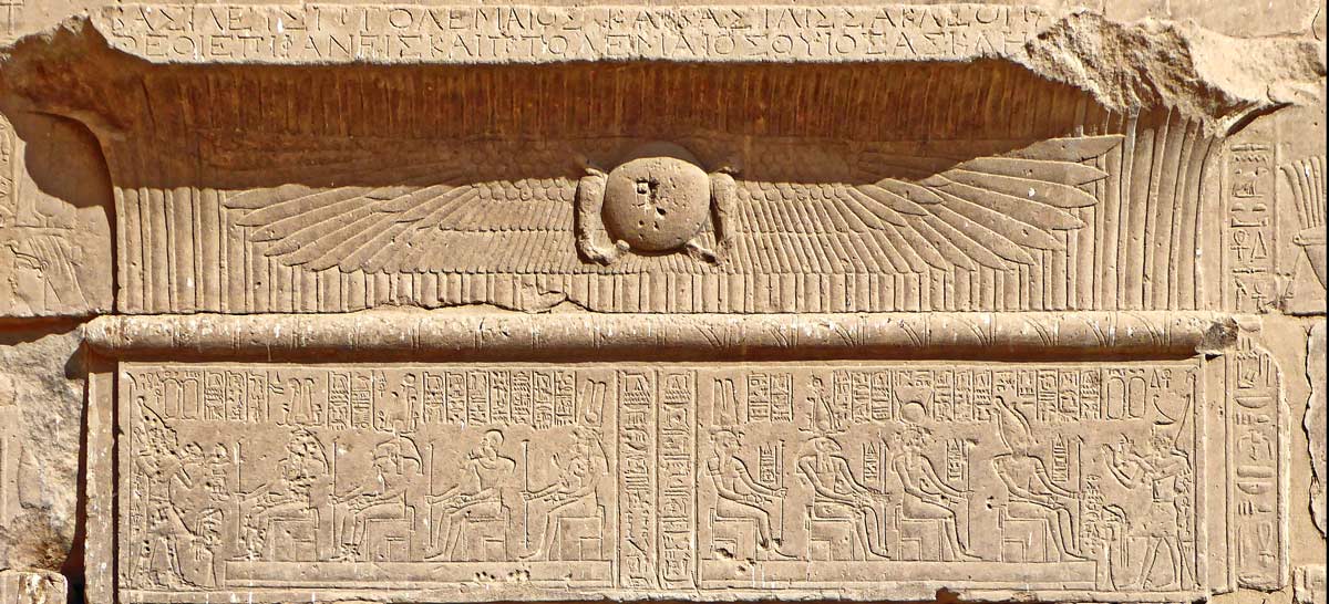 Au dessus du disque ailé, une inscription est gravée en grec. Behedety étend ses ailes au dessus d'une double scène.