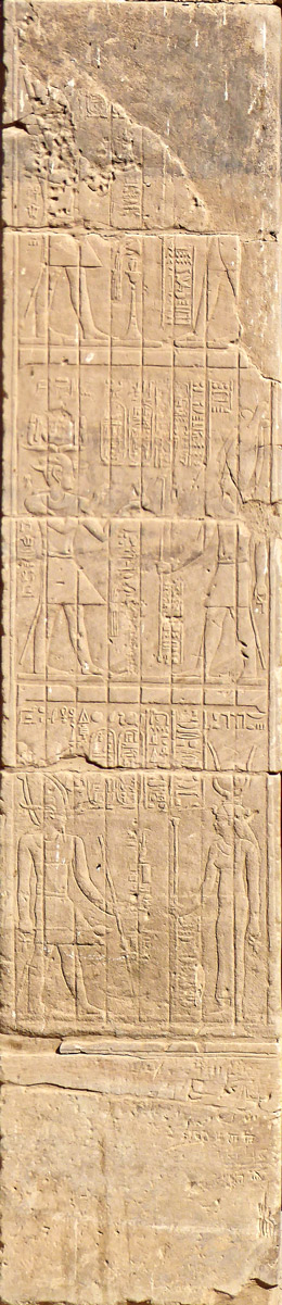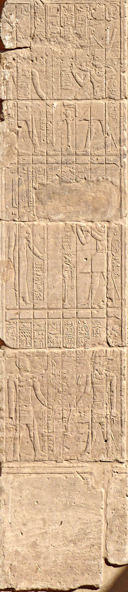 A gauche, Ptolémée V fait l'offrande de 2 vases de vin à Ptah, Thot, Imhotep et sa mère Kheredou-ankh.