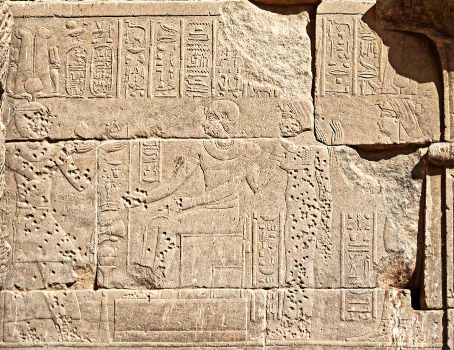 Côté Est, registre du haut : Ptolémée V offre de la nourriture à Khnoum, Satis et Anouqis.