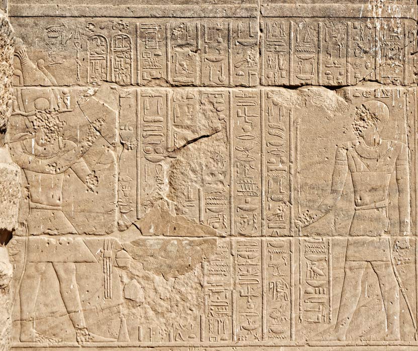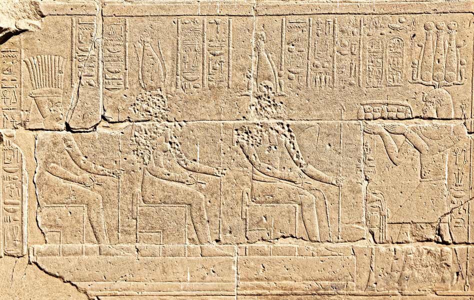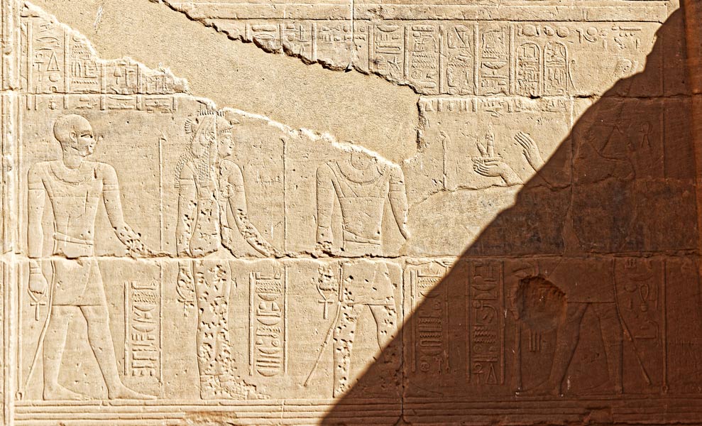Côté Est, registre du bas : le roi Ptolémée V fait l'offrande de la Maât à Osiris-Ounennefer, Isis et Imhotep divinisé.