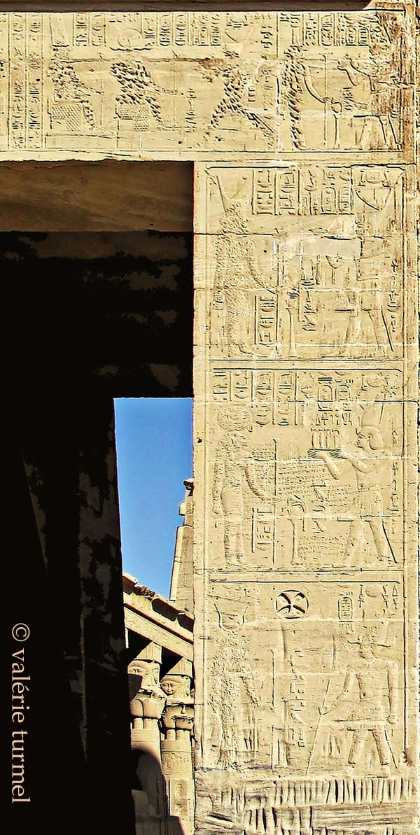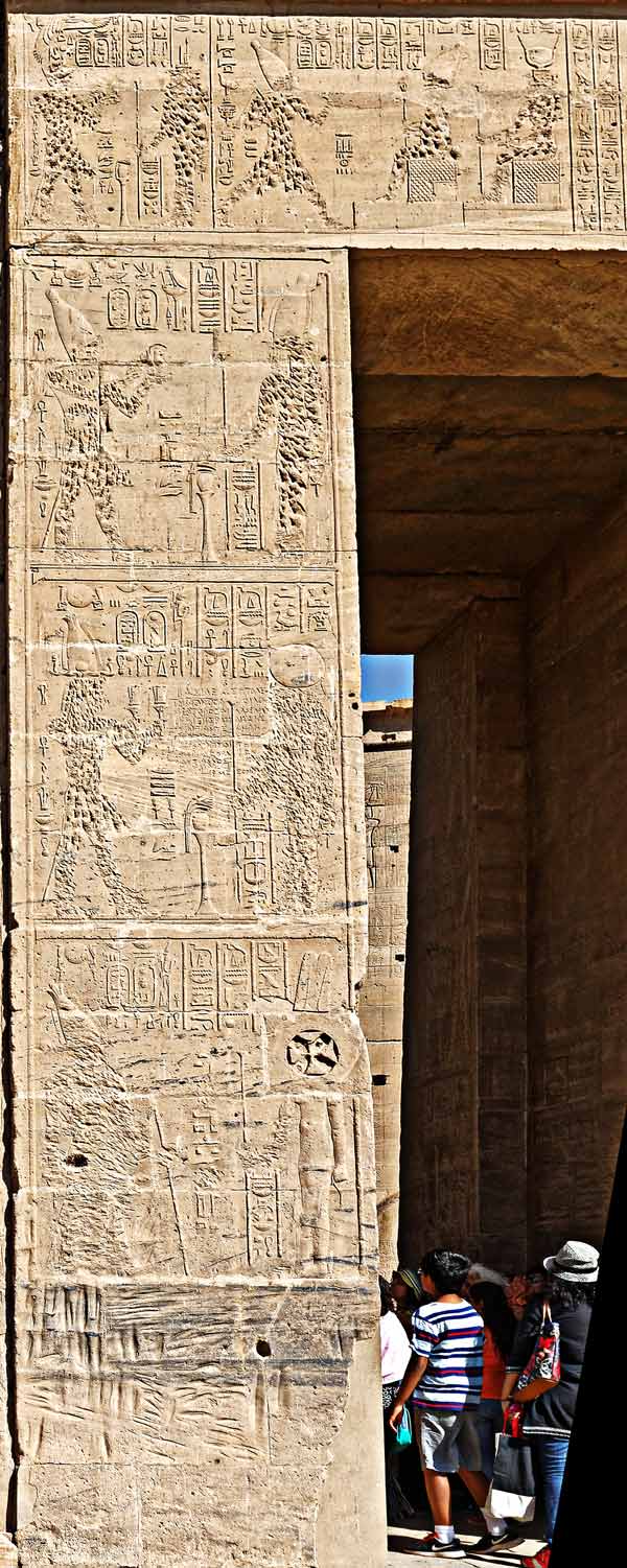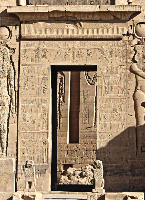 Située entre les 2 môles, la porte de Nectanebo comporte une corniche égyptienne ornée du disque ailé flanqué de 2 uraei. Les scènes sont très martelées.