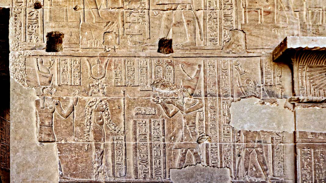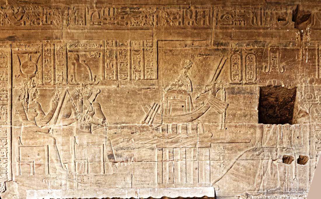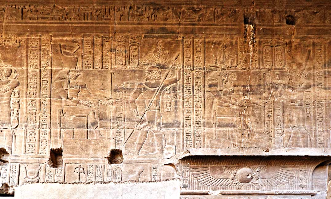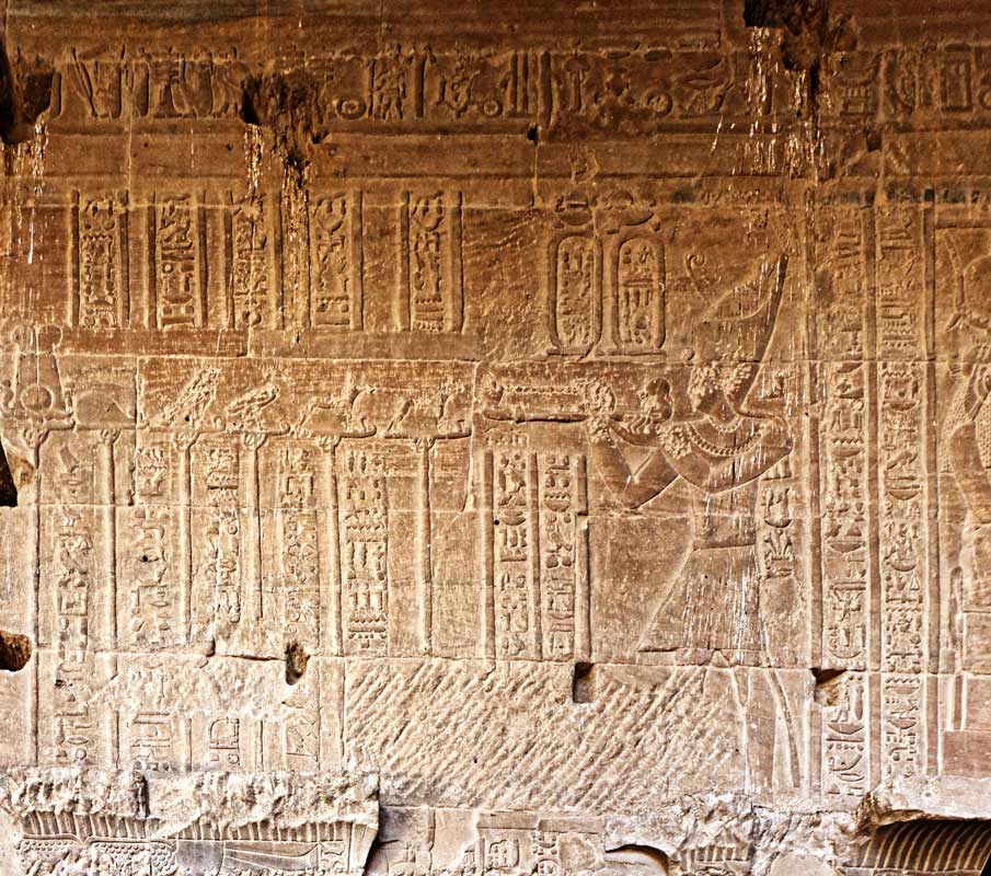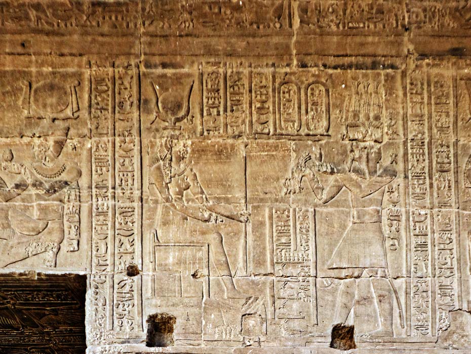 Côté Sud, cette scène se trouve au dessus de la porte de la première salle. Le roi Ptolémée XII Neos Dionysos offre du pain à Thot.