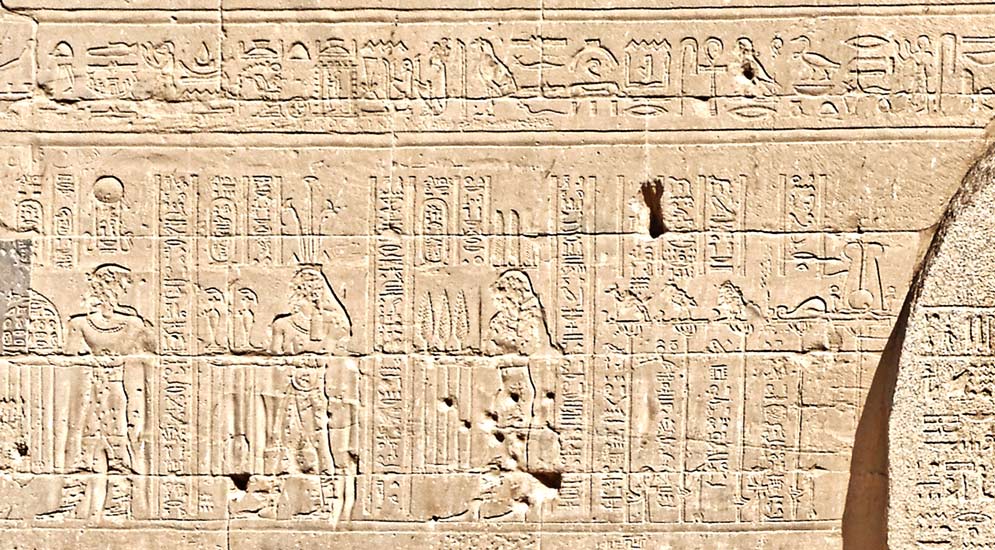 A droite, le roi Ptolémée VI suivi de la reine offre les champs à Osiris et Isis. Derrière le couple royal, Harpocrate.
