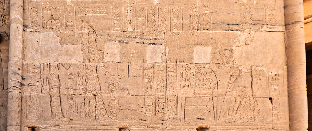 - en haut, le roi offre une barque à Horus d'Edfou. -second registre : le roi offre les 4 veaux à Osiris assis. Pour les 2 scènes suivantes, voir ci-dessous. A la base, le roi suivi de porteurs d'offrandes devant Osiris et Isis.
