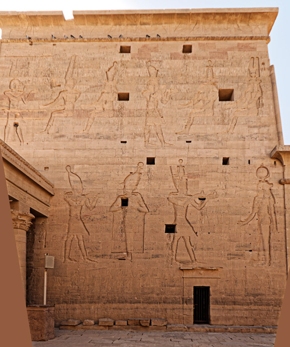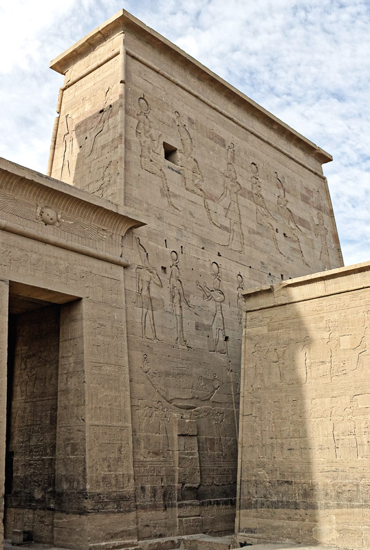 Sur le côté du môle, le roi Ptolémée XII Neos Dionysos encense Osiris et verse une libation.