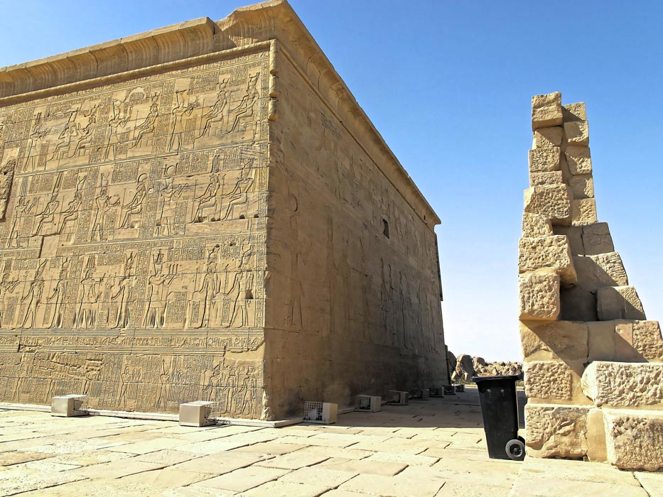 A droite sur la vue, le pan de mur est le restant du mur d'enceinte du temple.