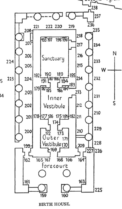 L'axe du mammisi est exactement Nord-Sud, différent de celui du temple. La différence est matérialisée par le contour du second pylône en partie tracé en haut à droite du plan. Le bâtiment comprend 3 salles , notées I, II, III par M. Peters-Dendéract. Elles sont précédées par une petite salle hypostyle à 4 colonnes et entourées d'un déambulatoire à colonnes. La dernière salle est la sanctuaire. La salle II contient la représentation de la théogamie.