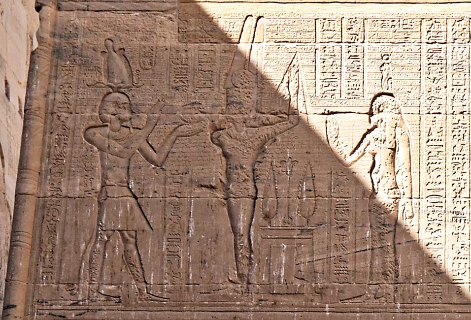 Le roi Ptolémée XII se présente devant Arsenouphis, Thot de Pnoubs et Amon. Thot porte la coiffure de Chou-Onouris.
