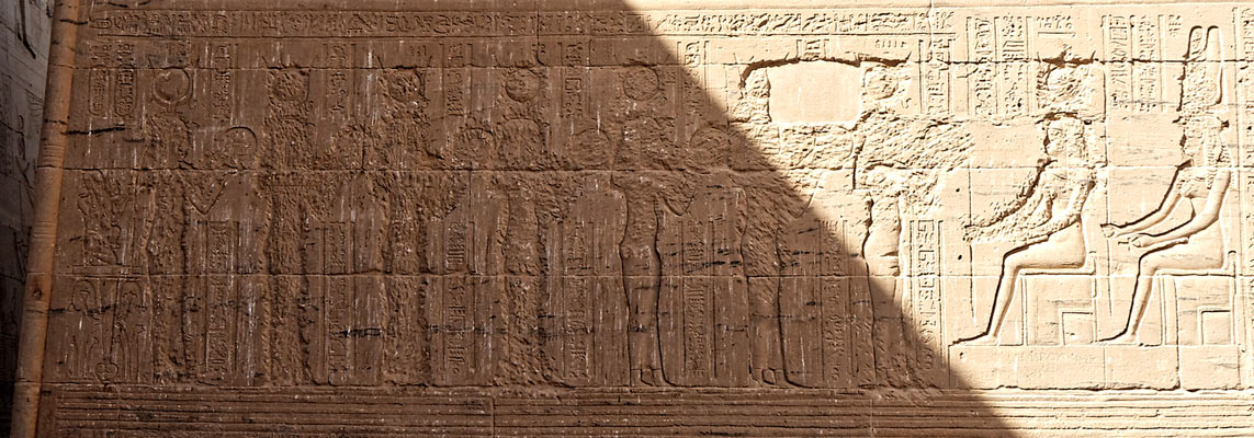 Devant lui, une procession de 7 Hathor jouant du tambourin se dirige vers deux déesses assises : Isis et Hathor.