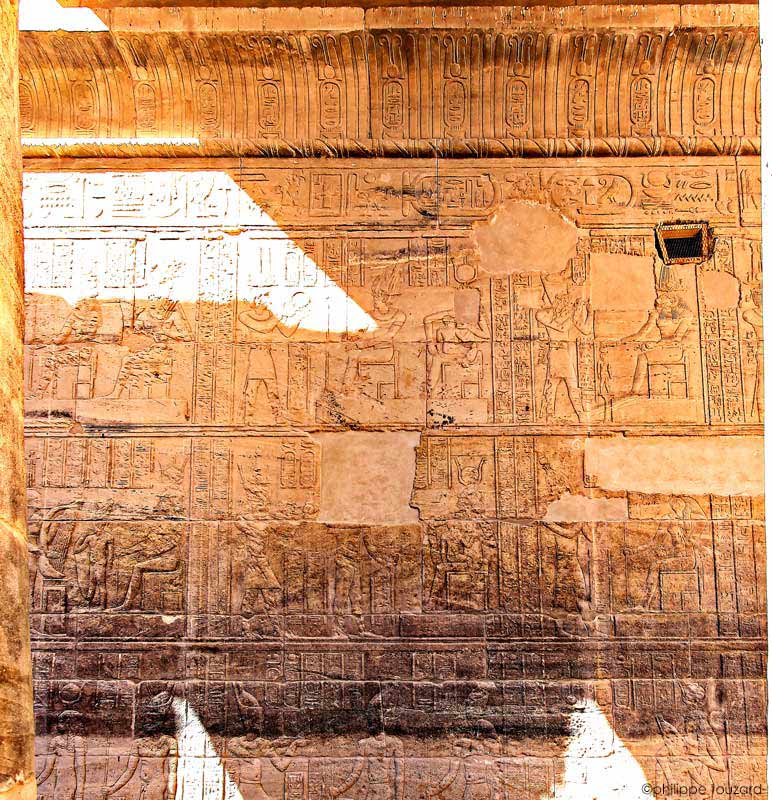 Registre du haut : l'empereur Auguste offre de l'onguent à Horus et Hathor. L'empereur fumigène de l'encens devant Rê-Horakhty, Chou et Tefnout.