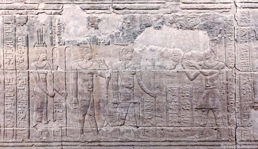 L'empereur Tibère offre le collier menat à Hathor, Harsiesis et Wepset (?)