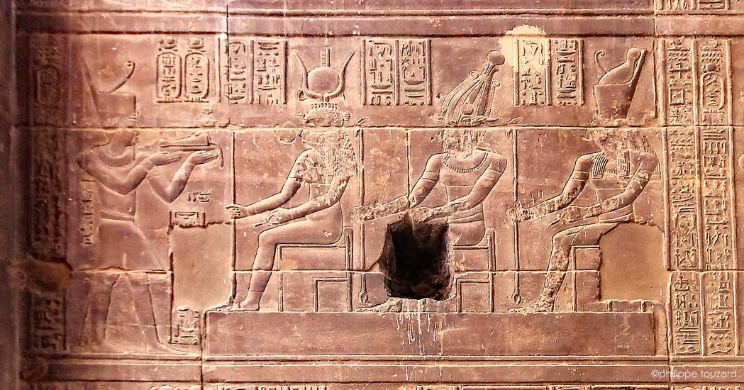 L'empereur Tibère offre le collier Menat à Isis, Osiris et Horus.