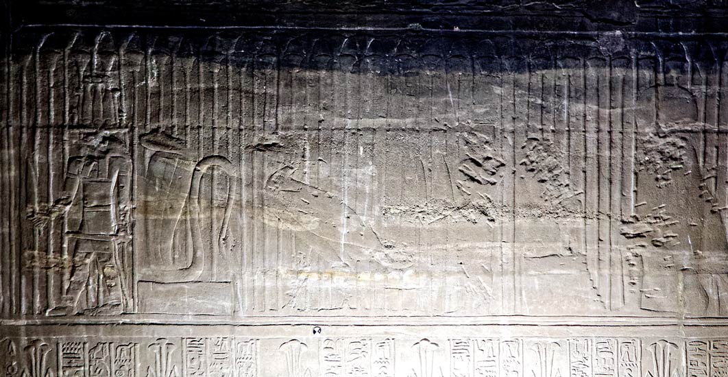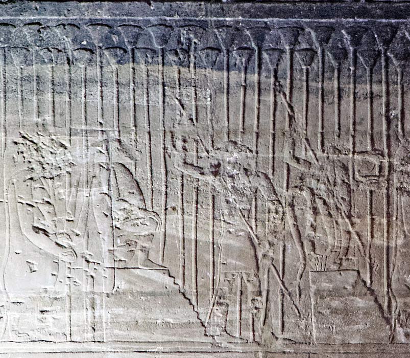 Paroi est : entre les scènes de la théogamie et les dieux Nil tout en bas, une série de génies protecteurs sont représentés. Contrairement aux autres scènes tournées vers le sanctuaire, ils sont tournés vers la porte pour la protéger et la défendre avec leurs armes : lances, couteaux. Deux représentations énigmatiques se trouvent au milieu. (voir ci-dessous).