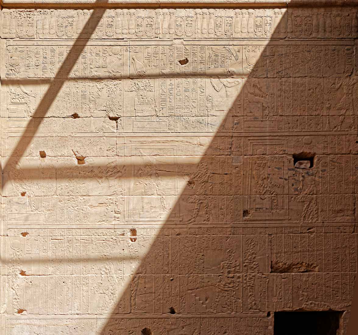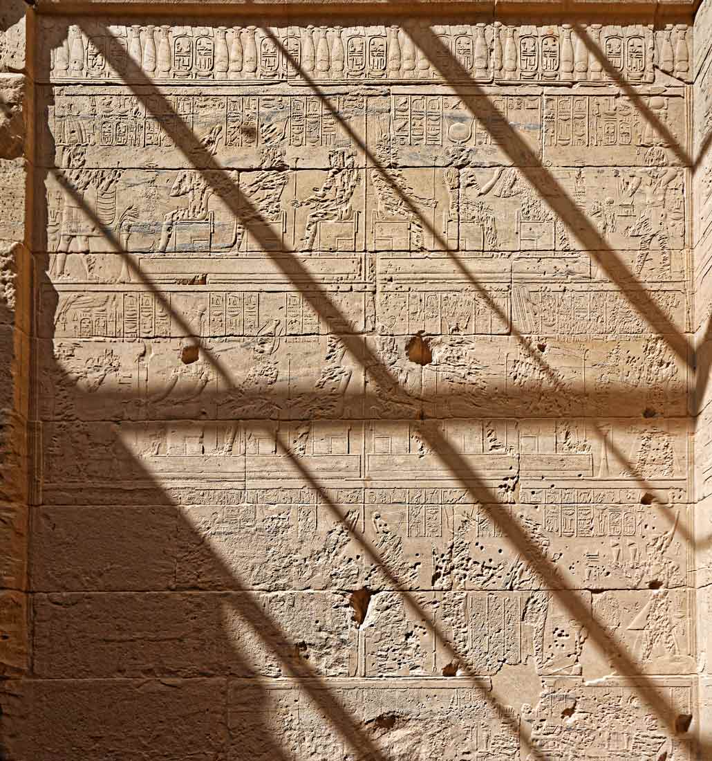 - registre du milieu : le roi ouvre une chapelle contenant Hathor, puis se dirige vers une autre chapelle contenant Osiris et offre un miroir à Isis.