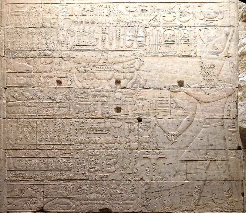 Cette salle est à ciel ouvert, donc éclairée alors que les autres salles sont dans l'ombre. La paroi Est est entièrement occupée par la scène de la grande offrande .Le roi coiffé de la double couronne encense les offrandes de la main gauche et verse l'eau purificatrice de la min droite. On peut supposer que cette offrande s'adresse à Isis. Les offrandes sont très variées, on y voit même des oiseaux vivants.