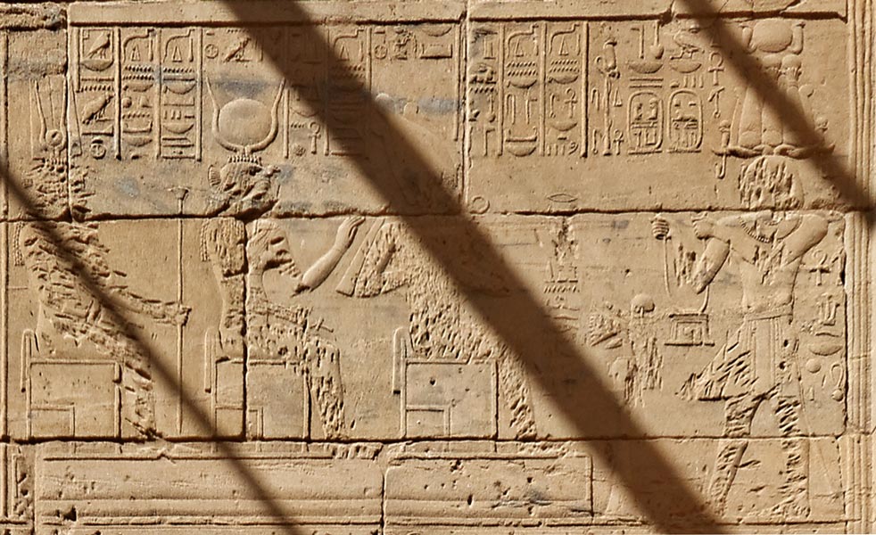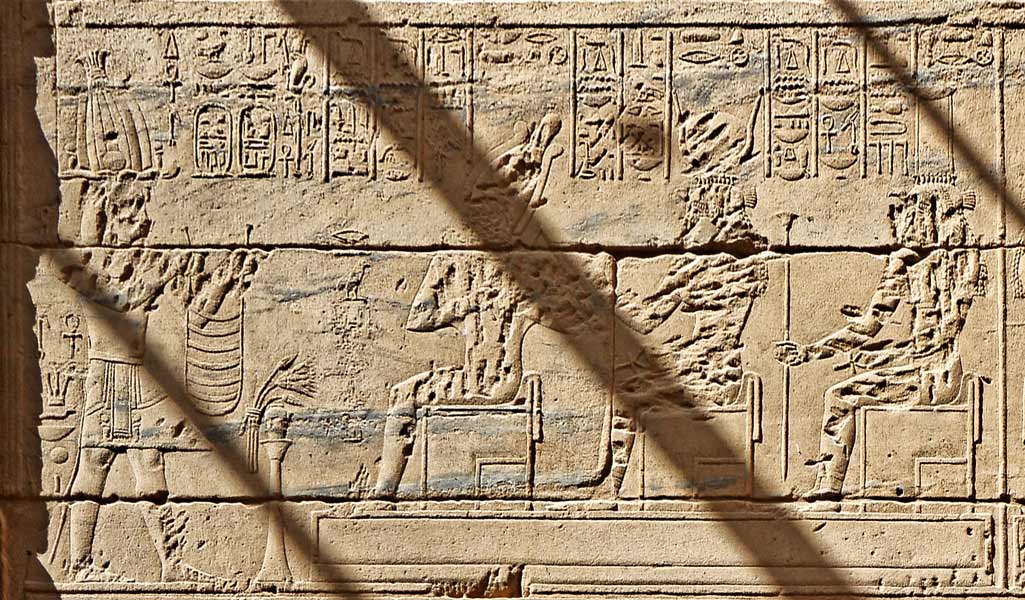 Le roi offre de la myrrhe à Khnoum, Satis et Anoukis. Khnoum donne au roi toute vie et toute puissance.