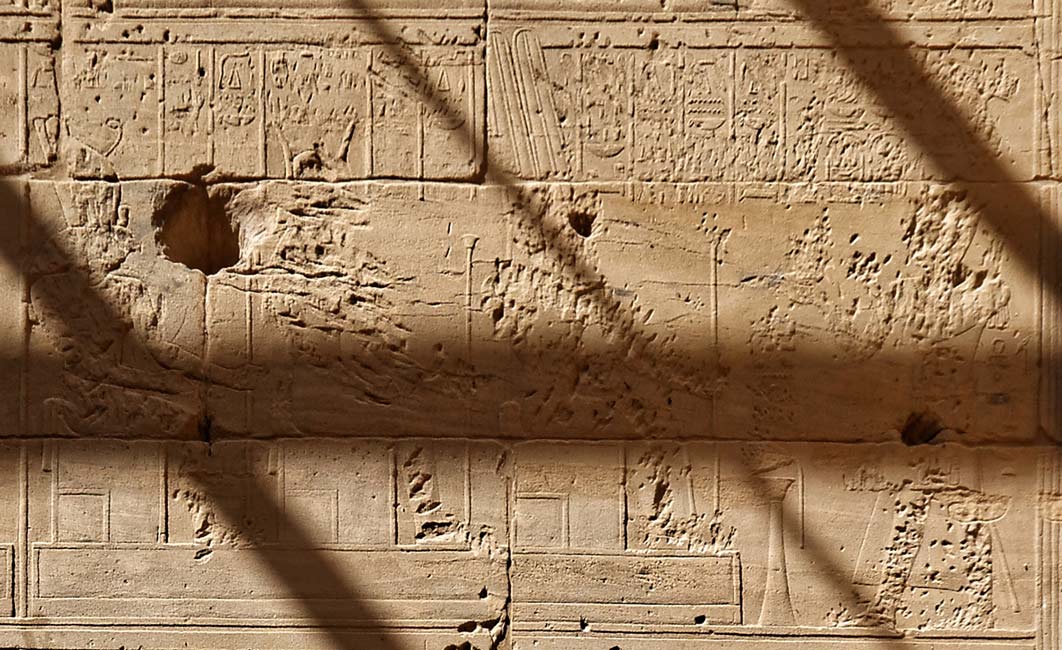 Au dessus, dans la scène de droite, le roi fait une offrande à Osiris, Isis et Harsiésis. Osiris donne au roi toute force, toute santé et toute bravoure. Isis, la grande, mère du dieu, lui donne toutes les terres en offrande.
