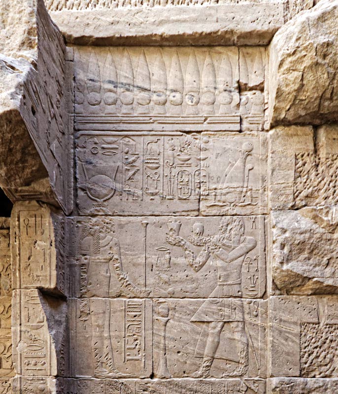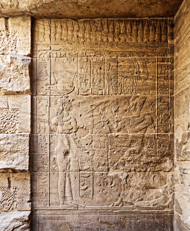 Le roi Ptolémée II Philadelphe est coiffé de la couronne osirienne. Il fait une double offrande de vin et de cassolette d'encens à Isis. Entre les deux, un guéridon supporte un vase avec des fleurs. Isis lui donne toute vie et toute puissance.